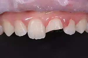 Conséquences du traumatisme : Perte d’un fragment dentaire, recollé à deux reprises depuis son accident il y a 9 mois.
