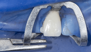 Une fois la pince retirée et le crampon fixé par le composite bleu, la digue va pouvoir être étirée autour de la dent. Une tension sur la gencive visible en vestibulaire est le témoin de la position basse du crampon.